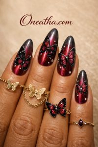 Burgundy Nails Burgundy nails bring a rich, glossy look that feels bold, elegant, and timeless. From deep wine tones to chrome finishes and detailed designs, these styles are perfect for a confident, elevated vibe. Fall In Love With Purple Butterfly Nails ->